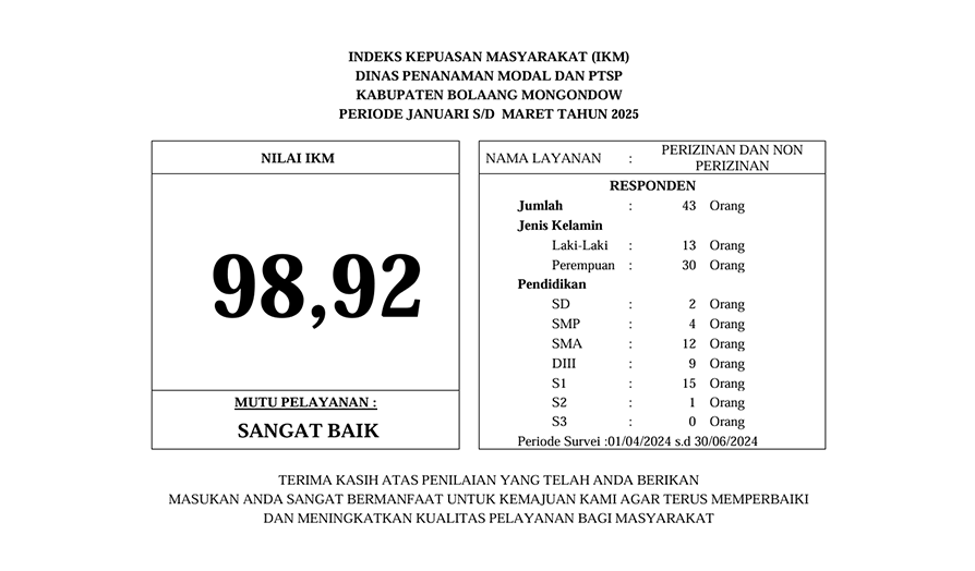 Dinas Penanaman Modal dan Pelayanan Terpadu Satu Pintu (DPMPTSP) Kabupaten Bolaang Mongondow telah melakukan Survey Indeks Kepuasan Masyarakat (IKM), dengan jumlah responden penerima layanan yang diperoleh pada periode Januari hingga Maret 2025 yaitu 43 orang responden