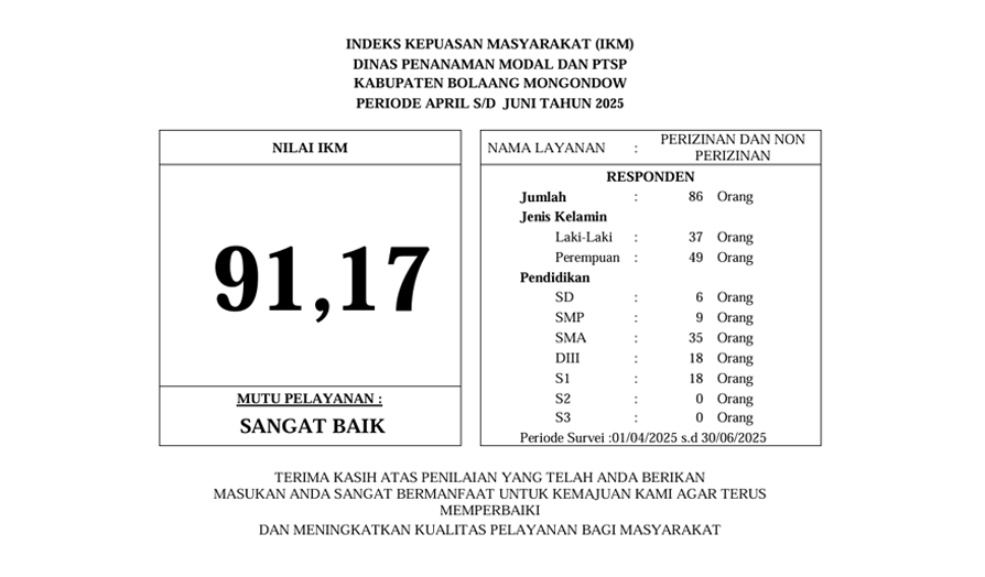 Dinas Penanaman Modal dan Pelayanan Terpadu Satu Pintu (DPMPTSP) Kabupaten Bolaang Mongondow telah melakukan Survey Indeks Kepuasan Masyarakat (IKM), dengan jumlah responden penerima layanan yang diperoleh pada periode April hingga Juni 2025 yaitu 86 orang responden