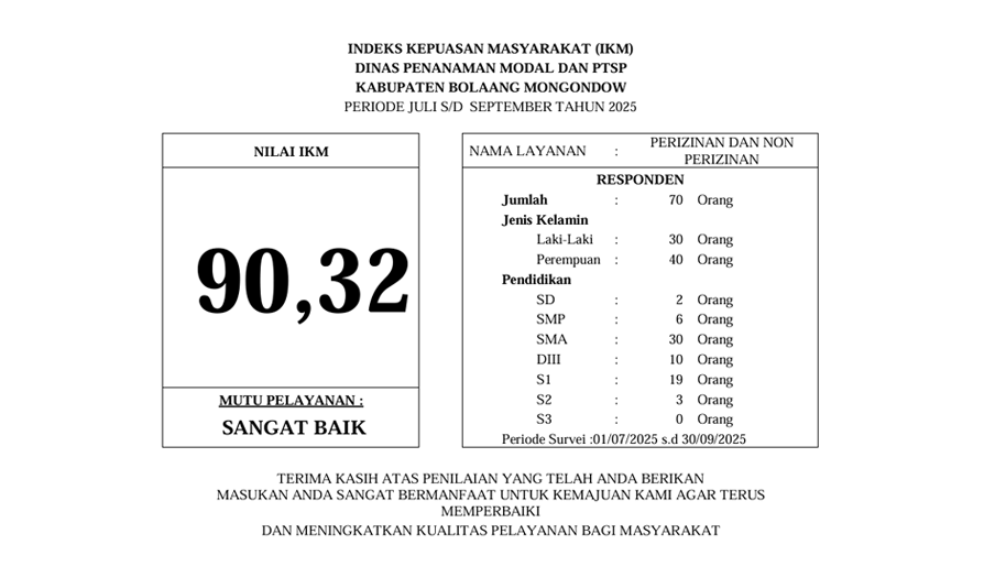 Dinas Penanaman Modal dan Pelayanan Terpadu Satu Pintu (DPMPTSP) Kabupaten Bolaang Mongondow telah melakukan Survey Indeks Kepuasan Masyarakat (IKM), dengan jumlah responden penerima layanan yang diperoleh pada periode Juli hingga September 2025 yaitu 70 orang responden